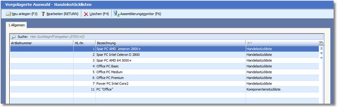 Das Programm öffnet die vorgelagerte Auswahltabelle der Handelsstücklisten.