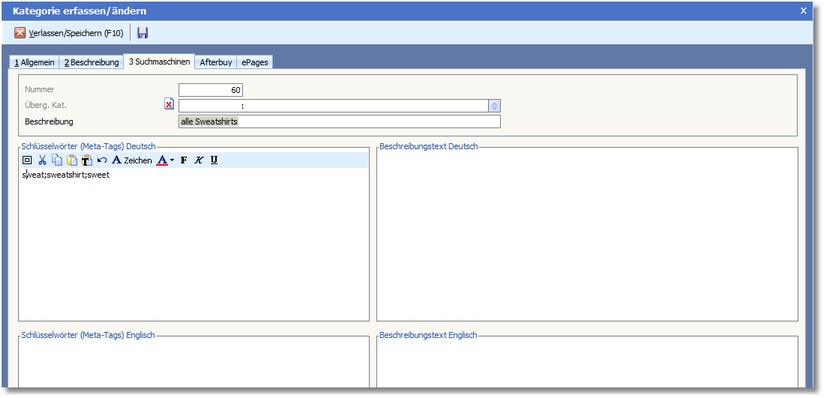 3. In der Karteikarte "Suchmaschinen" können Sie Schlüsselwörter in Deutsch und in Englisch hinterlegen: