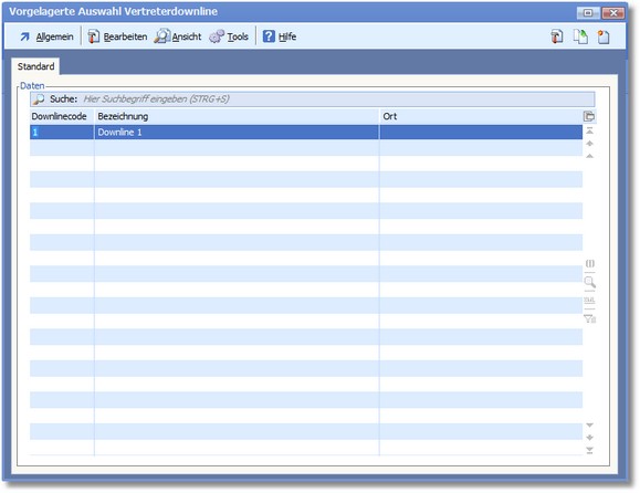 1. Drücken Sie in der vorgelagerten Auswahltabelle der Downlines die Funktionstaste [F3] oder wählen Sie den Menüeintrag "Allgemein > Neue Downline".