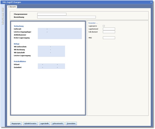 Dieses MIS-System stellt standardmäßig eine Informationsmaske bereit. Hier ersehen Sie im Wesentlichen die Stamminformationen der gewählten Chargen.