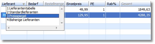1. Wählen Sie eine Bestellzeile aus. 2. Navigieren Sie den Cursor mit der [TAB]- oder [RETURN]-Taste in die Spalte LIEFERANT. 3. Drücken Sie in der Spalte LIEFERANT die Funktionstaste [F5], um eine Liste mit den möglichen Auswahltabellen aufzurufen.