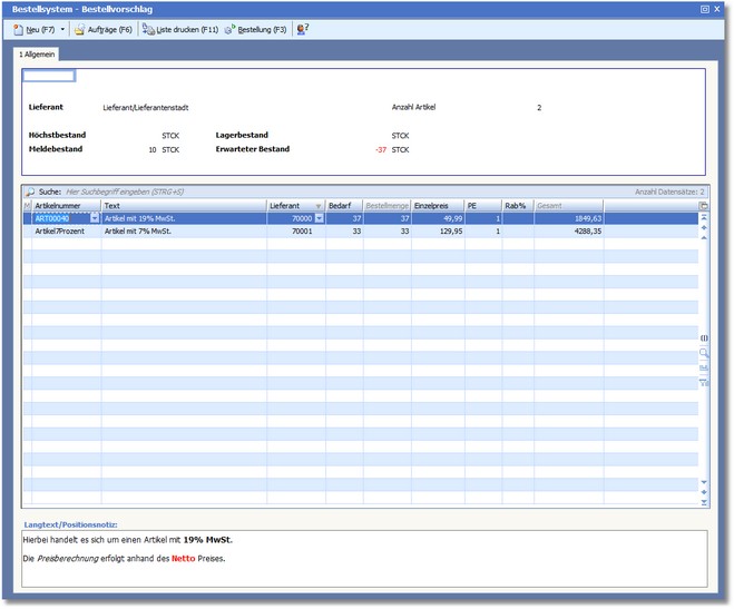 - die Bestellmenge beim Lieferanten (Karteikarte "Bestellvorschlag"),