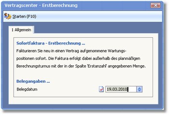 Neu in einen Wartungs- oder Mietvertrag aufgenommene Wartungspositionen können Sie sofort - also außerhalb des üblichen Berechnungsturnus - fakturieren. Die Berechnung erfolgt dabei mit der in der Spalte "Erstanzahl" angegebenen Menge. Diese Menge wird dann beim nächsten Beleglauf ignoriert.