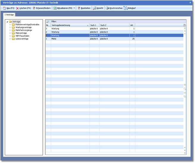 Über das Vertragscenter können Sie die Vertragstypen "Rahmen/Kontrakt", "Wartungsvertrag", "Mietvertrag" und "Mehrfachvorgänge" für Kunden anlegen und bearbeiten.