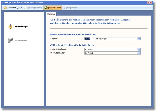 Nachfolgend wird beschrieben, wie bei der Ersteinrichtung des ePages-Marketplaces die Übernahme der Artikeldaten aus dem Shop erfolgt.