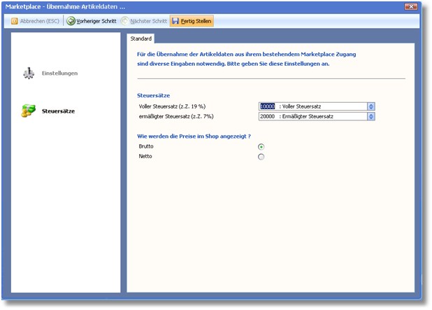 Hier werden die Felder für den Steuersatz sowie die Preisanzeige (BRUTTO/NETTO) im Shop vorbelegt. Diese können ebenfalls bei Bedarf geändert werden.