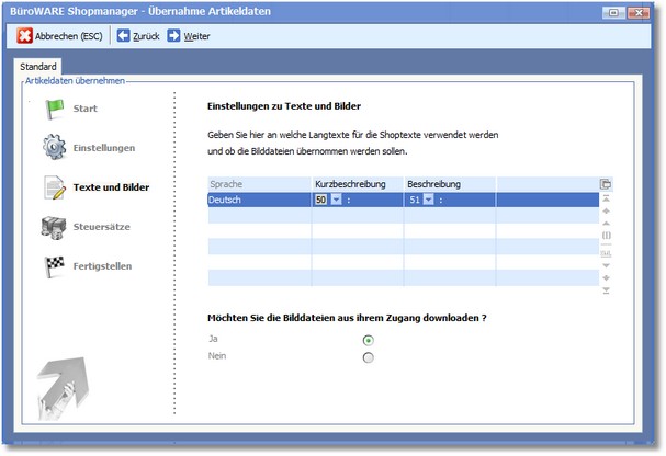 In der nächsten Maske können Sie Einstellungen für Texte und Bilder vornehmen. Auch hier können die Voreinstellungen ohne Änderung übernommen werden.