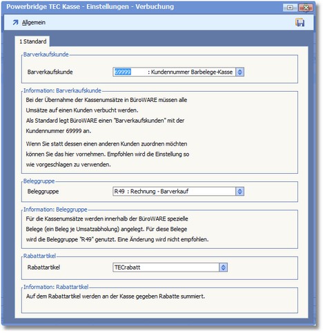 << Hier KLicken um eine Inhaltsübersicht anzuzeigen >> Navigation: BüroWARE Powerbridge > TEC-Kassenschnittstelle > Verwaltung TEC Kasse > Verbuchung |