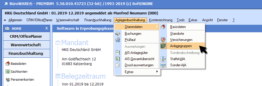 Im Menü "Anlagenbuchhaltung" wählen Sie "Stammdaten > Anlagegruppen".