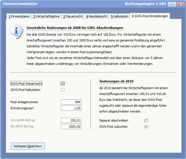 Legen Sie hier durch Aktivierung der entsprechenden Option fest, ob Anlagegüter dem GWG-Pool zugebucht oder sofort abgeschrieben werden sollen.