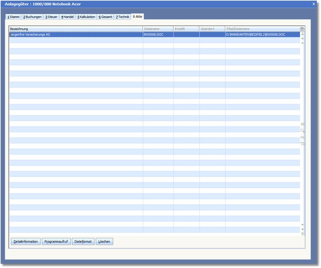 1. Sie startet bei eingetragenem Dateinamen in der Spalte DATEINAME das externe Programm. Hier wurden also die dokumentspezifischen Angaben mittels der Detailinformationen hinterlegt. Entspricht dem Button: <Programmaufruf>