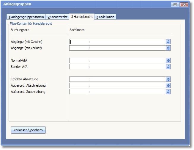 << Hier KLicken um eine Inhaltsübersicht anzuzeigen >> Navigation: Anlagenbuchhaltung > Stammdaten > Anlagegruppen > Die Karteikarte "Handelsrecht" |