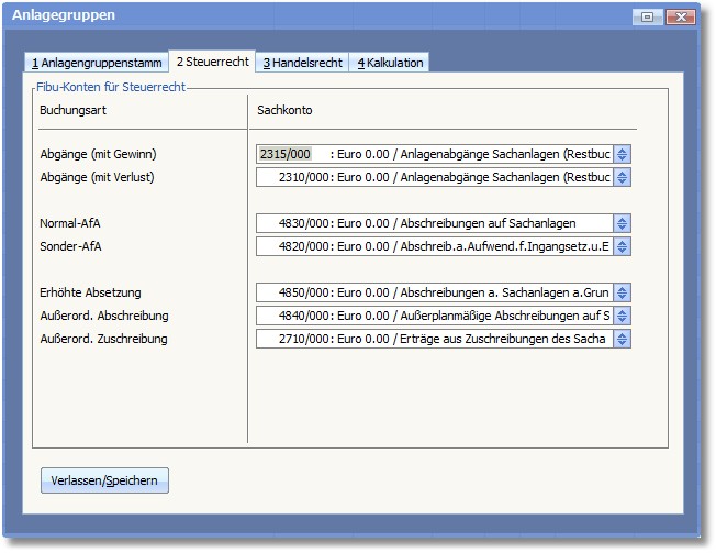 << Hier KLicken um eine Inhaltsübersicht anzuzeigen >> Navigation: Anlagenbuchhaltung > Stammdaten > Anlagegruppen > Die Karteikarte "Steuerrecht" |