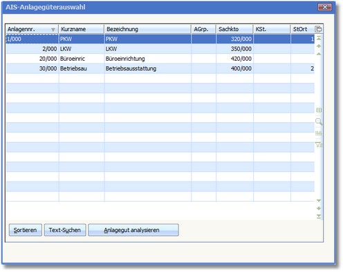 Zunächst öffnet sich eine vorgelagerte Auswahltabelle, in der alle Anlagegüter aufgelistet sind.