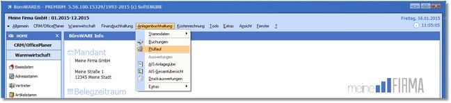 1. Klicken Sie mit der Maus im Hauptmenü auf "Anlagenbuchhaltung > Prüflauf".