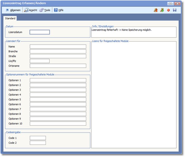 Es erscheint zunächst die Eingabemaske der Lizenzerfassung mit leeren Feldern.