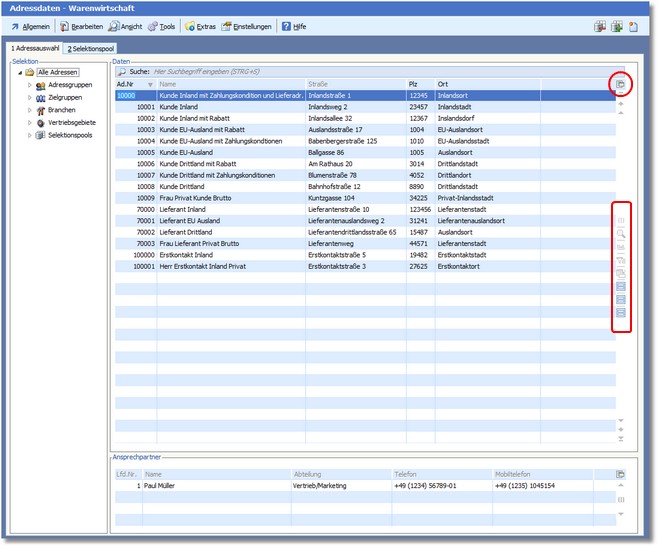 In einigen Tabellen werden hier noch verschiedene Darstellungen angeboten, z.B. im Adressstamm der Wechsel zwischen Tabellen- und Maskendarstellung sowie die Visitenkartendarstellung mit und ohne Bild.