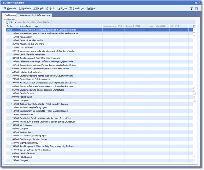 Die Sachkontenverwaltung besteht aus drei Karteikarten und der Menüleiste mit den für die jeweils aktive Karteikarte bereitgestellten Funktionen.