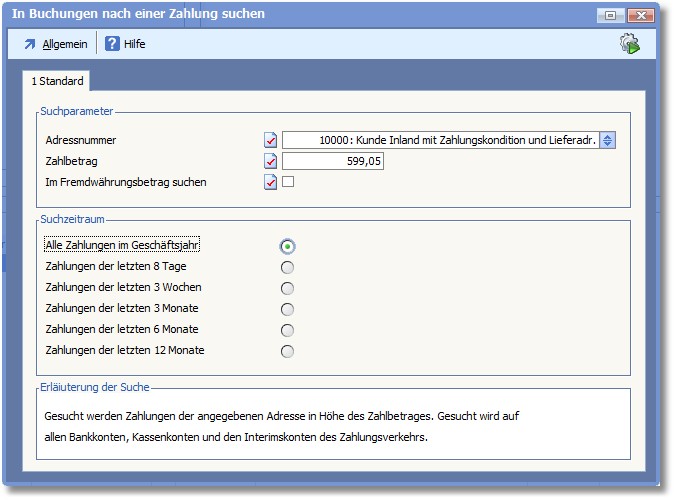 So können Sie in der Buchungsmaske nach einer Zahlung suchen: