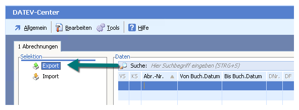 1.        Markieren Sie in der Baumauswahl des Datev-Centers "Export".