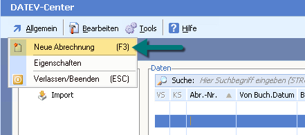 2.  Drücken Sie jetzt die Funktionstaste [F3]  oder wählen Sie im Menü "Allgemein" den Eintrag "Neue Abrechnung".