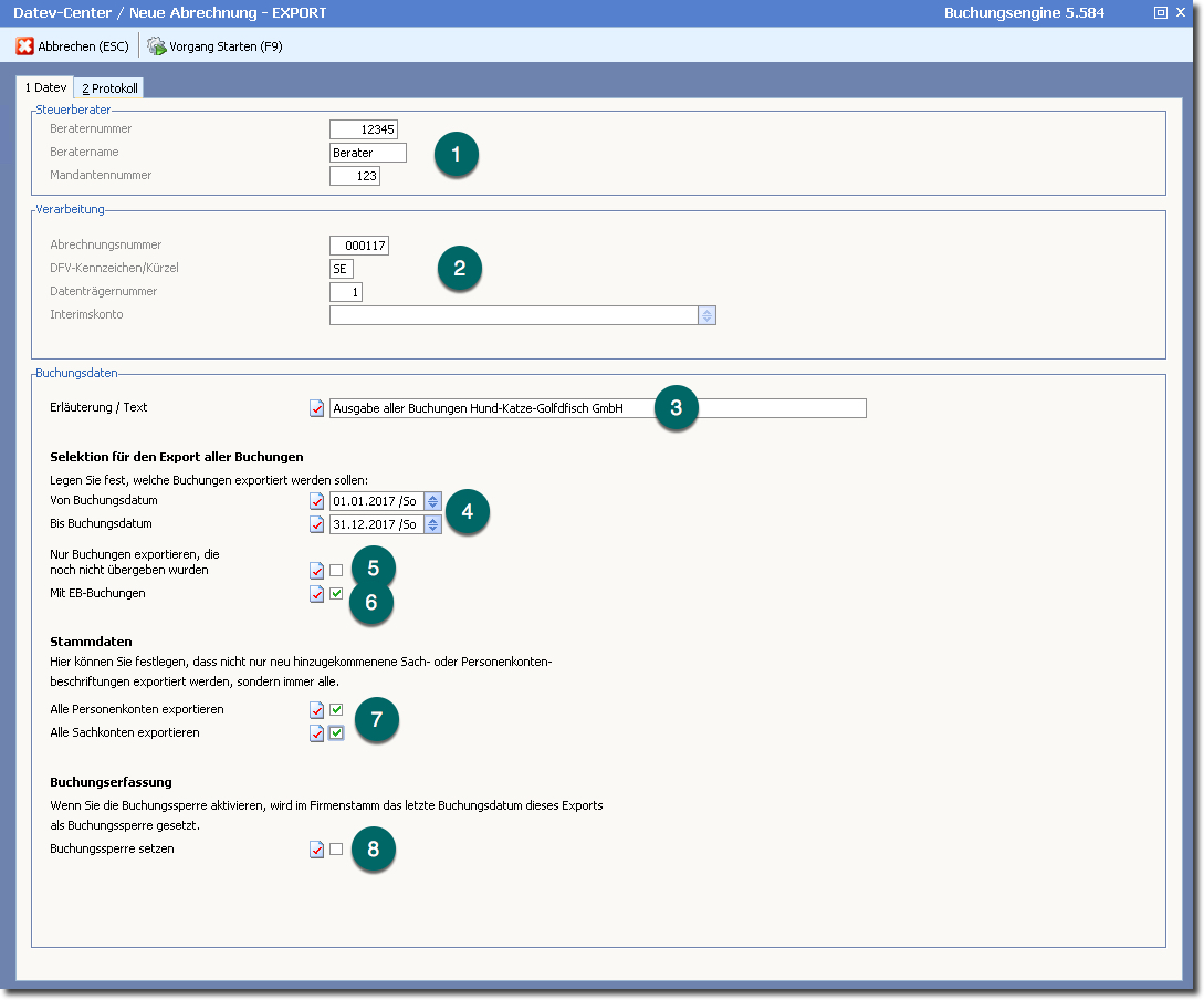 ➎ Buchungen erhalten bei der Ausgabe ein Kennzeichen und werden somit festgeschrieben. Eine Änderung von Ausgegebenen Buchungen ist normalerweise nicht möglich. Setzen Sie das Kennzeichen "Nur Buchungen exportieren, die noch nicht übergeben wurden", dann wird auf das Exportkennzeichen geprüft und nur neue Buchungen ausgegeben. (Im Beispielbild ist das Kennzeichen nicht aktiviert, d.h. es würde alle Buchungen - neue und auch bereits übergebene - exportiert.)