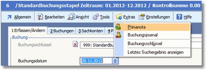 << Hier KLicken um eine Inhaltsübersicht anzuzeigen >> Navigation: Finanzbuchhaltung > Laufende Vorgänge > Stapelbuchungen > Die Karteikarte "Buchungen" > Buchungserfassung > Die Karteikarte "Erfassen/Ändern" > Buchungen bearbeiten - Menü > Primanota |