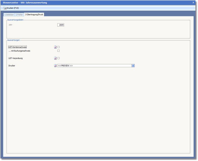 Der Dialog zur Erstellung der Umsatzsteuer-Jahresauswertung wird zunächst mit der Karteikarte "Selektion" geöffnet.
