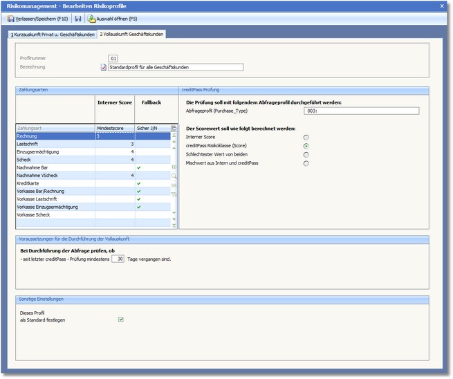 Navigation:  Finanzbuchhaltung > Laufende Vorgänge > OP-Verwaltung > Debitorenkennzahlen/Rating > Debitorenrating einrichten > Die Karteikarte "Risikoprofile" > Risikoprofile bearbeiten >