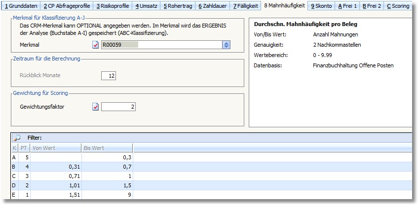 In diesem Praxisbeispiel wäre ein A-Kunde im Bereich Mahnungen derjenige, der z.B. 10 Rechnungen im Zeitraum hat und von diesen wurden bisher 3 Rechnung gemahnt (Mahnhäufigkeit = 0,3).