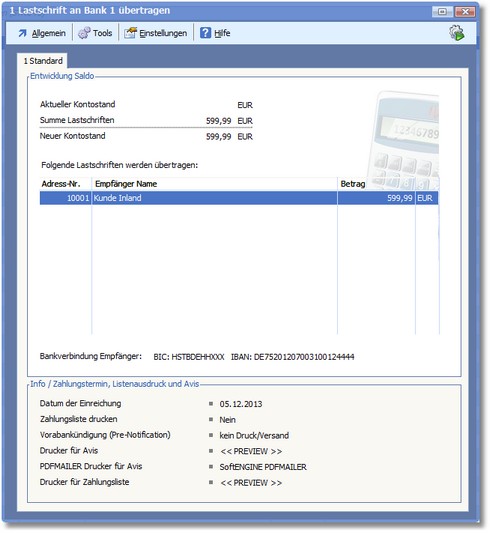 << Hier KLicken um eine Inhaltsübersicht anzuzeigen >> Navigation: Finanzbuchhaltung > Laufende Vorgänge > Zahlungsverkehr > Zahlungseingang > Die Karteikarte "Zahlungsstapel" > Lastschrift an Bank übertragen |