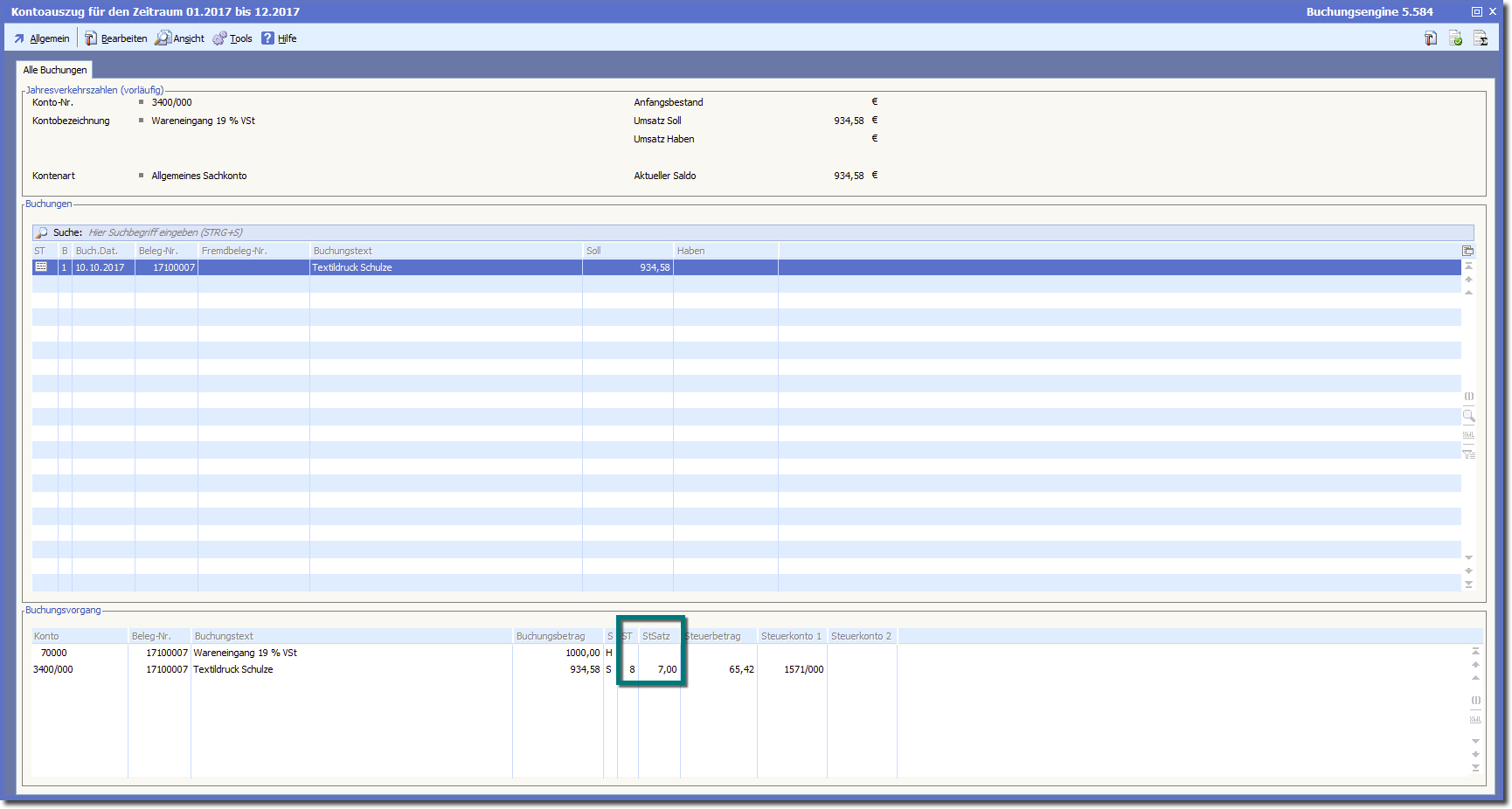 1.Wenn die Einstellung im Konto so korrekt ist, muss die Buchung nochmals bearbeitet und mit dem korrekten Steuerschlüssel gespeichert werden.