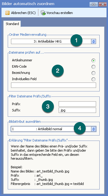 Tragen Sie Präfix und Suffix des Dateinamen ein, so dass nur der teil des Dateinamens verglichen wird, der dem Inhalt im zugeordneten Feld (Artikelnummer, EAN usw. – siehe Pkt. 2) entspricht.