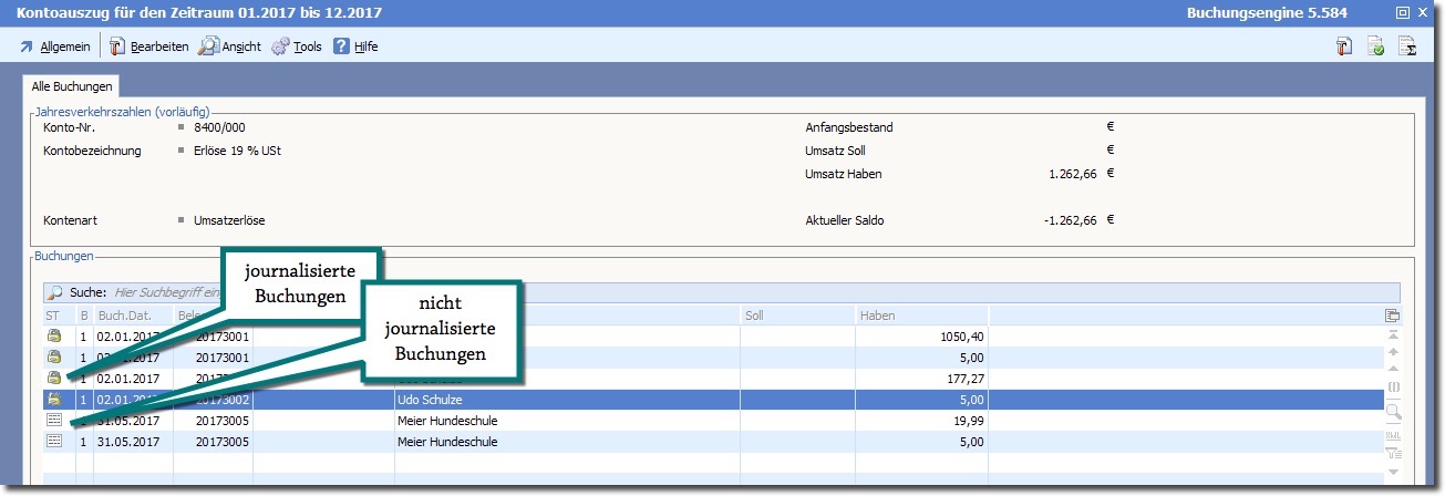 Am Symbol in der ersten Spalte (bzw. der Spalte “Statusbitmap” erkennen Sie, ob die Buchung bearbeitet werden kann oder journalisiert ist.
