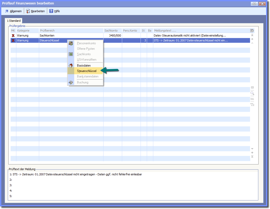 Dazu können Sie direkt mit der Maus (rechte Maustaste) auf den Fehlereintrag klicken und die Bearbeitung "Steuerschlüssel" auswählen.