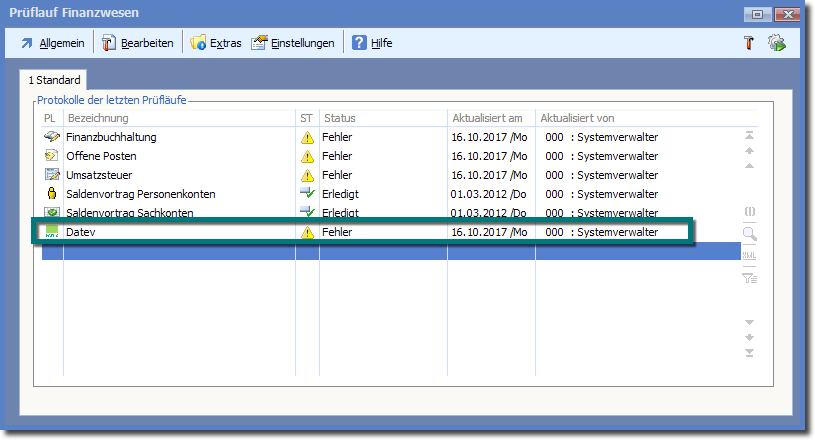 << Hier KLicken um eine Inhaltsübersicht anzuzeigen >> Navigation: Finanzbuchhaltung > Monatliche/periodische Arbeiten > Finanzbuchhaltung prüfen > Prüflauffehler und deren Bearbeitung > Fehler im DATEV-Prüflauf |