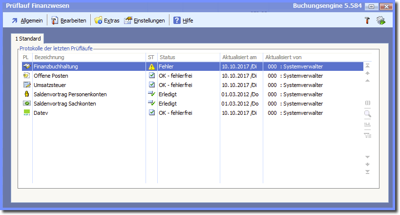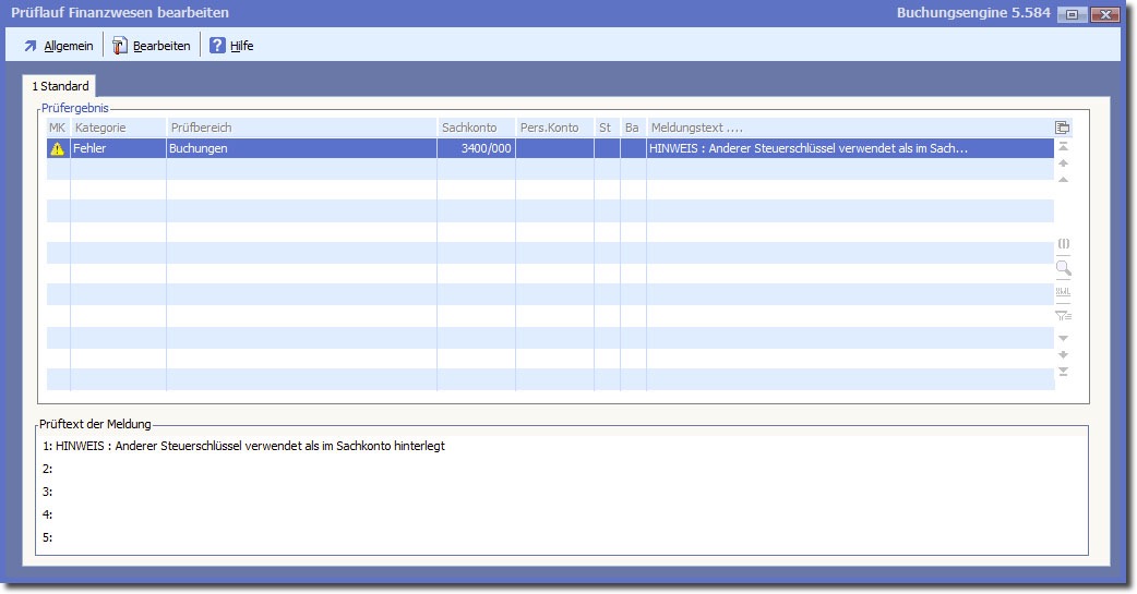 << Hier KLicken um eine Inhaltsübersicht anzuzeigen >> Navigation: Finanzbuchhaltung > Monatliche/periodische Arbeiten > Finanzbuchhaltung prüfen > Prüflauffehler und deren Bearbeitung |
