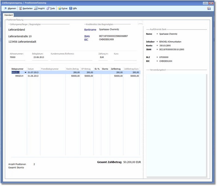 5. Durch Doppelklick auf eine Lieferantenzahlung können Sie die Positionserfassung für diese Zahlung öffnen, in der die einzelnen Zahlungspositionen aufgeführt sind.