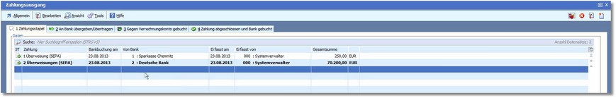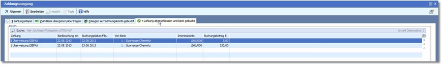 Im Zahlungsausgang wurde damit der Zahlungsstapel von der Registerkarte 3 verschoben und befindet sich nun als abgeschlossen in der Registerkarte "4 Zahlung abgeschlossen und Bank gebucht".