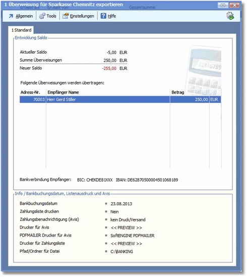 Hier im Beispiel ist DTA-Clearing eingestellt, man könnte aber ebenso direkt an die Banken übertragen.