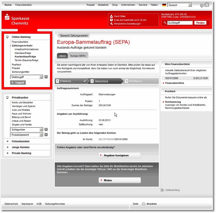 10. Im Zahlungsverkehr Ihres Online-Bankings (hier im Beispiel: Sparkasse) wählen Sie die entsprechende Datei aus.
