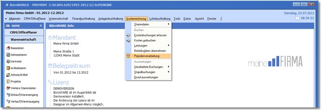 1. Klicken Sie mit der Maus im Hauptmenü auf "Kostenrechnung > Periodenverarbeitung."