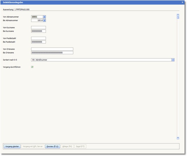 Soll eine Einschränkung auf einen Wertebereich (z.B. Von Adressnummer 1000 Bis Adressnummer 10014) erfolgen, so müssen Sie diese Werte in den "Von ..." "Bis ..."-Feldern eingeben.