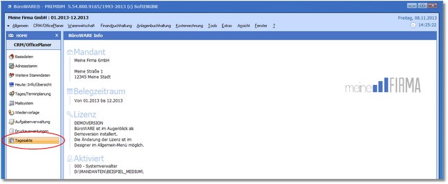 1. Klicken Sie im Arbeitsplatz des CRM/OfficePlaners auf die Verknüpfung "Tagesakte".