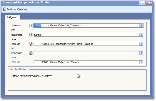 Aktivieren Sie den Status dieses Feldes þ, wenn bei dieser angelegten Adressbeziehung die gegenseitige Auszifferung in der Finanzbuchhaltung möglich sein soll.