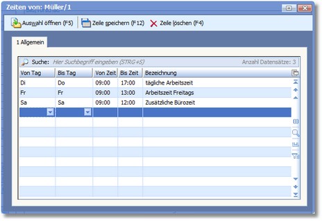 3. In den Spalten VON/BIS TAG und VON/BIS ZEIT können Sie die verschiedenen Zeiten Ihres Ansprechpartners eintragen bzw. ändern. z.B. Öffnungszeiten, Mittagspause, Telefonzeiten usw. Mit [F5] öffnet sich in den Spalten "Von/Bis Tag" eine Auswahltabelle.
