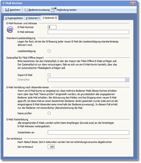 << Hier KLicken um eine Inhaltsübersicht anzuzeigen >> Navigation: CRM/OfficePlaner > Mailsystem > Mail einrichten > E-Mail-Assistent - Extras > E-Mail-Konten > Neues E-Mail-Konto > Die Karteikarte "Optionen II" |
