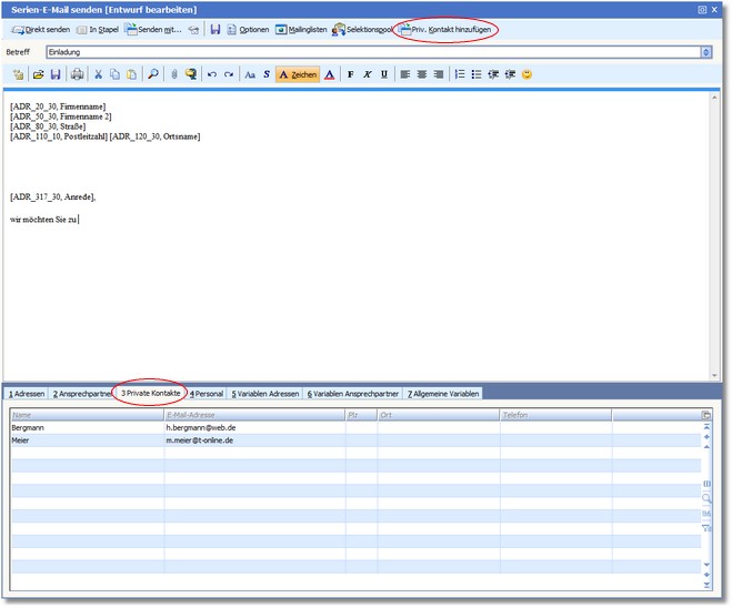 Wenn ein privater Kontakt die Mail erhalten sollen, können Sie über die Karteikarte "Private Kontakte" diese auswählen und in die Liste der Mailempfänger aufnehmen.
