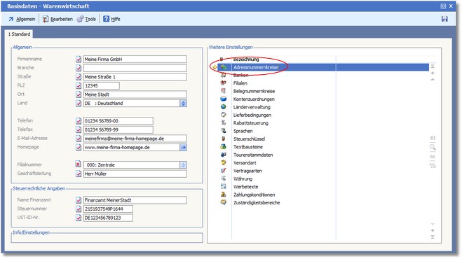 Der Adressnummernkreis ist für Kreise in den Adressen vorgesehen, muss sich aber innerhalb der Grenzen der Nummernkreise der Basisdaten bewegen.