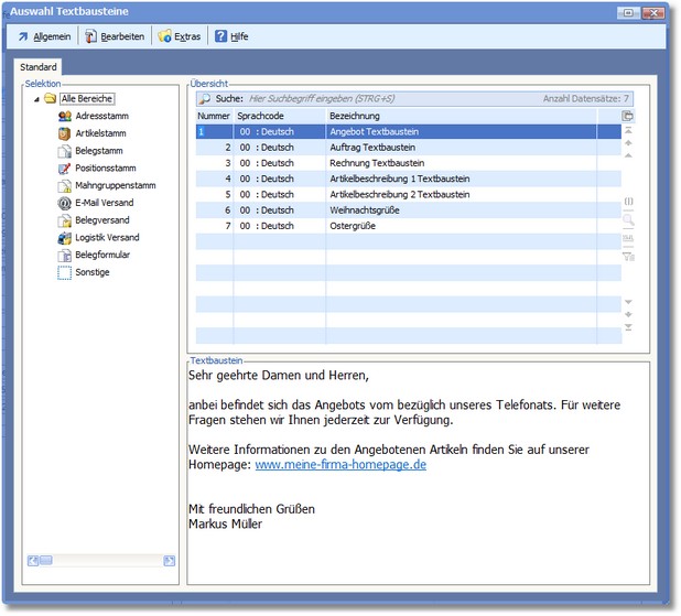 << Hier KLicken um eine Inhaltsübersicht anzuzeigen >> Navigation: Warenwirtschaft > Stammdaten > Basisdaten > Textbausteine |